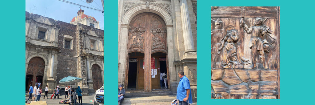 La enorme iglesia conserva sus puertas originales con relieves en madera que representan a Santa Inés y a Santiago Matamoros. (Fotografías, Graciela Nájera Sánchez)
