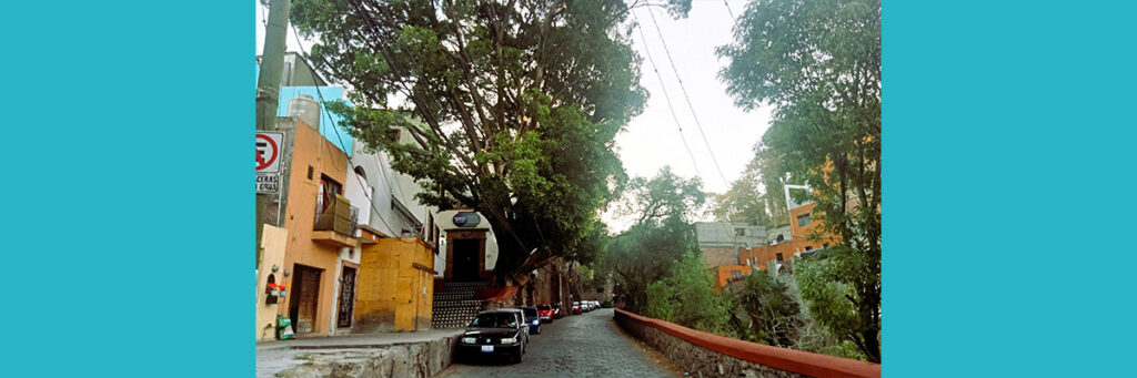 Un enorme laurel de la India antecede a la ex hacienda de San Luisito; a un lado, el río de Cata todavía corre a cielo abierto.