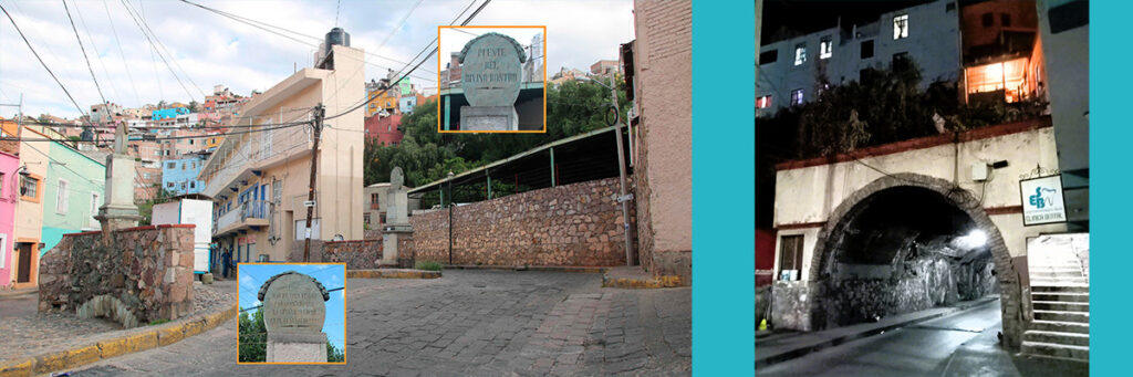 Puente del Divino Rostro: a la izquierda, aún se aprecia uno de los arcos bajo los cuales pasa el río; a la derecha, el inicio de la rampa al Callejón del Terremoto. En la siguiente imagen: salida del Túnel Santa Fe.