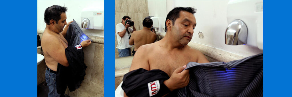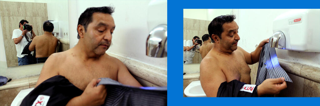 Saltaba yo de un secador a otro, para no sobrecalentarlos, cuando a través del reflejo del espejo vi a mi compañero fotógrafo Bernardo Moncada quien, súper divertido, me estaba tomando fotos. Él ya se había quitado la chamarra que traía, también mojada, pero de hechura especial para la lluvia, por eso el agua no le caló tanto como a mí y a mi chaleco.
