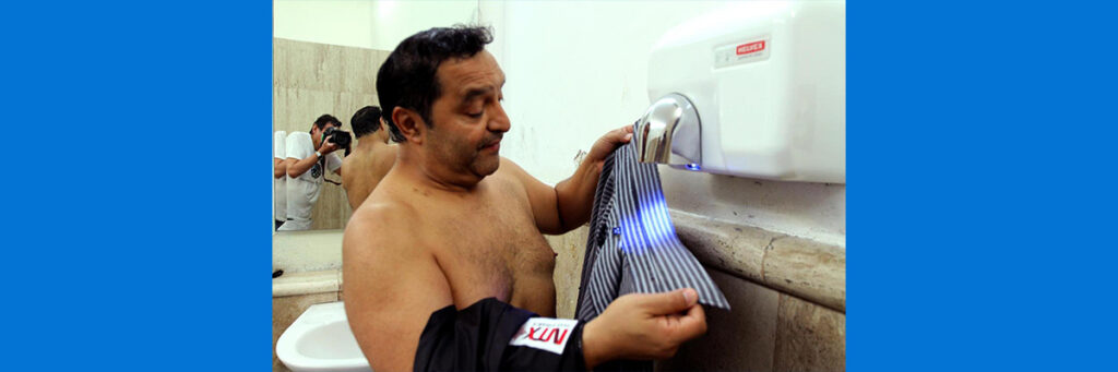 Para mi fortuna, los baños cuentan con secadores de aire. Más tardé en verlos que en quitarme el chaleco y la camisa. Juro que no miento ni exagero: las dos prendas se podían exprimir. Primero sequé la camisa, para ponérmela y no exhibirme sin ella en el baño. En esa tarea estaba cuando me pareció escuchar el obturador de una cámara fotográfica.