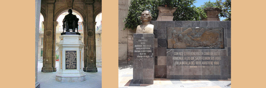 Memorial juarista que, en Palacio Nacional, recuerda la importancia de Silao en el triunfo liberal sobre los conservadores. En seguida: Monumento a los caídos en la Batalla de Silao.