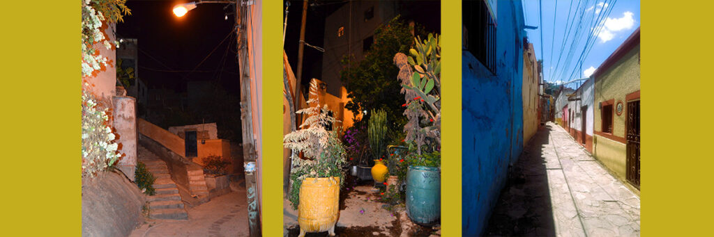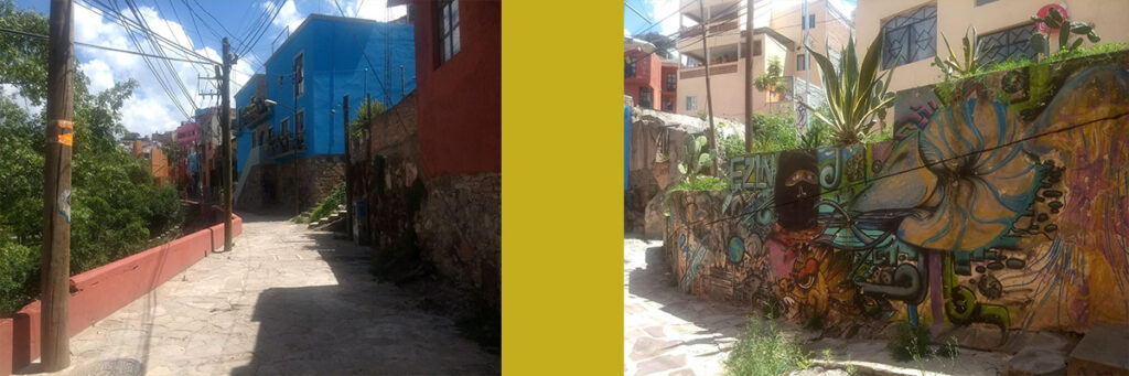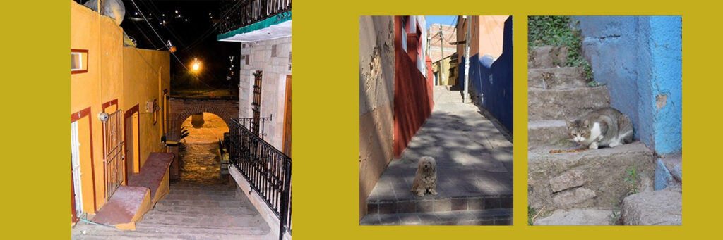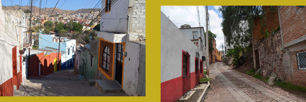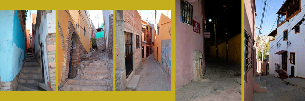 Por su parte, el Callejón de la Libertad, tras enlazar con Hoyos Colorados, sigue en línea convergente hasta encontrarse con Atarjea, en un punto donde acaba la vista escénica y uno se encuentra con un pasillo al que bordean coloridas viviendas y conduce a la salida del enredijo, mejor dicho, a tres salidas: por un lado, hacia la Plaza Hidalgo, patio de recreo de las mencionadas ranas de piedra y ocasional escenario musical; por otro, a la calle lateral del Jardín El Cantador y, en medio, una rampa que trabajosamente sube hasta conectar con San Cayetano, para completar un ciclo de trayectos que se separan, se dividen y reencuentran, trazo clásico del laberinto guanajuatense.