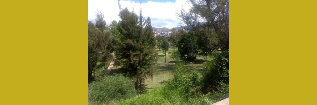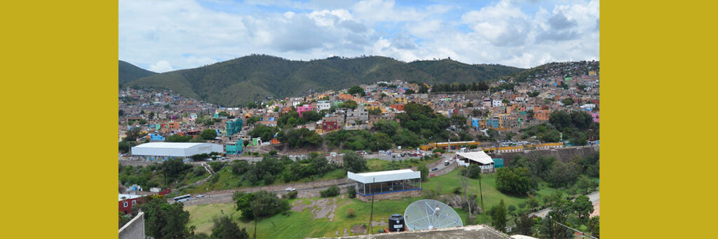 Es una vista distinta. En descenso por la Carretera Panorámica, desde el Cerro del Gallo, el paisaje observable es menos conocido que otros horizontes urbanos de mayor fama turística. Sin embargo, no faltan puntos de interés: fácilmente visibles son el Panteón de Santa Paula, hogar de las consabidas momias; la añosa ex estación del ferrocarril y, sobre todo, la amplia superficie color ocre o esmeralda de Los Pastitos ―según sea la temporada― y su plaza inmediata cubierta de ranas de cantera de diversos estilos que parecen croar al ritmo de la fuente contigua.