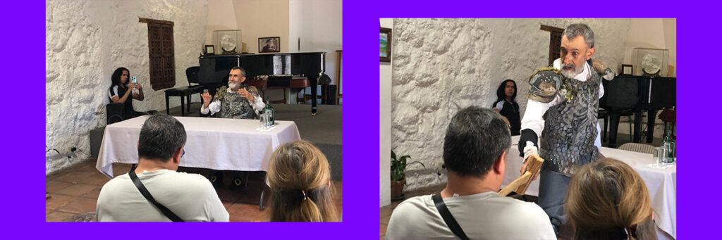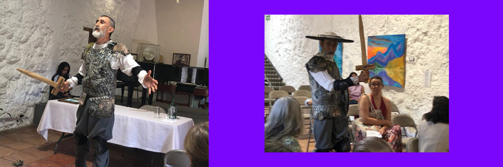 Yo, el Sancho Pança de Pedrones, hablé con ese hombre flaco como su rocín imaginario. Luce barbado y solemne después de una función y lleva su bacía que evoca al Yelmo de Mambrino. El caballero andante, que en su alucín lo mismo es don Qvixote que don Alonso de Quijano o don Miguel de Cervantes Saavedra, para la entrevista muestra un momento de cordura y se identifica;