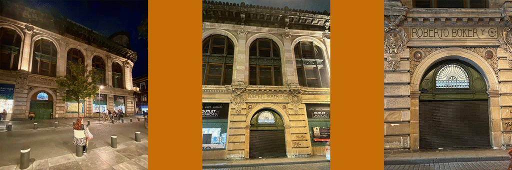 Una de ellas es la del Escudo Nacional Mexicano de aquella época, y la otra la del Escudo Alemán, también de aquella época. Sobre la entrada Sur del vestíbulo dice “Edificio Boker”. Sobre la entrada Oriente dice “Antigua casa de Roberto Boker y Cía”. El elevador de carga es una pieza bellísima: está decorada con láminas y piezas de fundición de cobre.