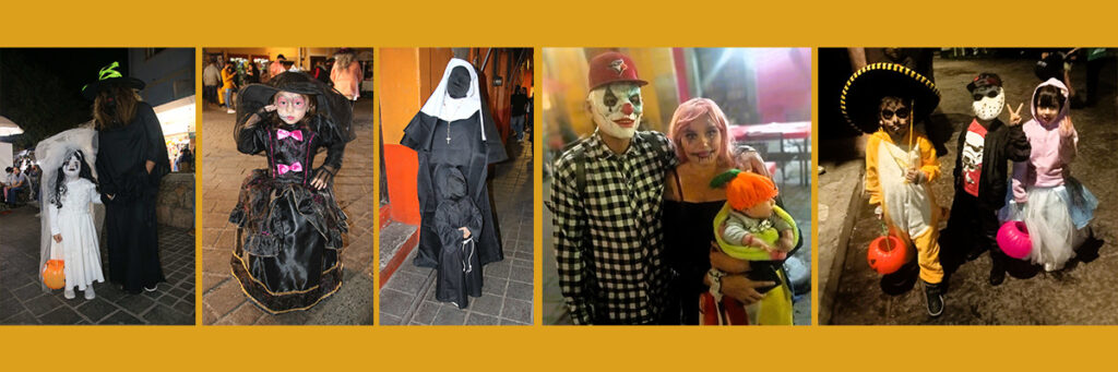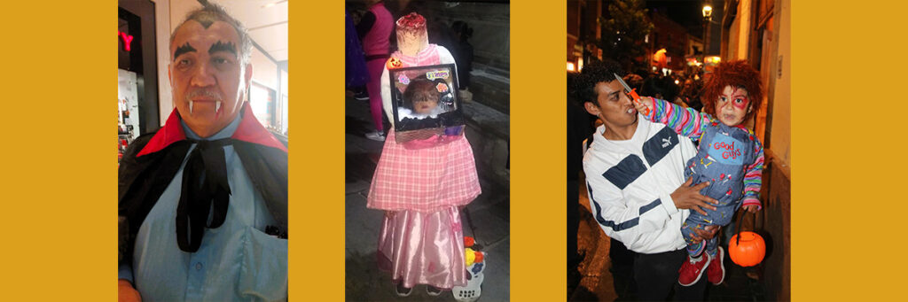 Hace algunos años, para evitar regaños y llamadas de atención por parte de vecinos xenófobos, los niños dejaron de pedir su “halloween” y ahora exigen su “calaverita”, es decir, el dulce que evitará alguna travesura. Sin embargo, la apoteosis son los disfraces; todo el catálogo de monstruos neogóticos y posmodernos surgen en cualquier noche, acompañados de sus padres, junto a los espectros de las noches de terror mexicana: Drácula, el Hombre Lobo, Frankenstein, momias estilo egipcio, la Llorona, Freddy Krueger, nahuales, Chucky, Merlina y otras terroríficas creaciones que demuestran el talento creativo de las mamás y el cariño por sus pequeños monstruillos.