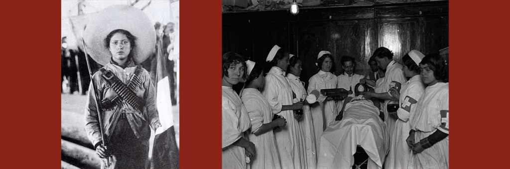 Adela Pérez Velarde, la mujer que al parecer inspiró la canción “La Adelita”. Siguiente imagen: un grupo de enfermeras atiende a una lección en la época revolucionaria.