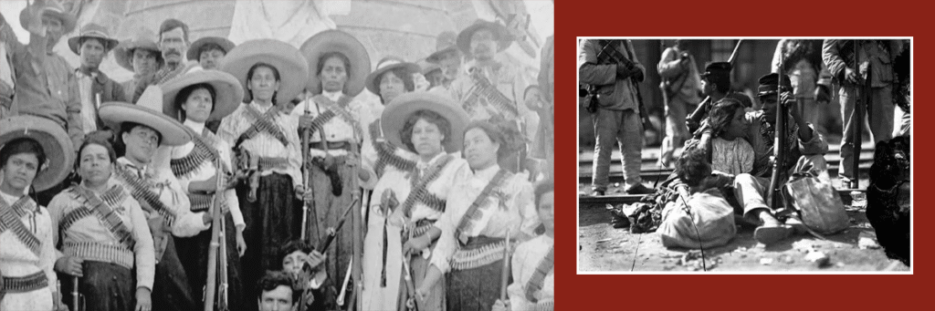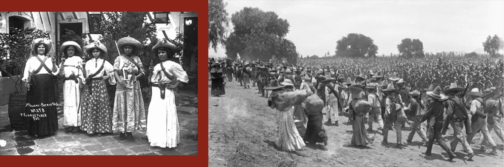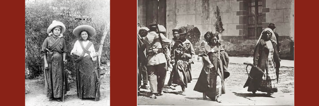 María Valentina Ramírez Avitia, heroína de la Revolución Mexicana. En la segunda fotografía, varias mujeres acompañan a un ejército en marcha.