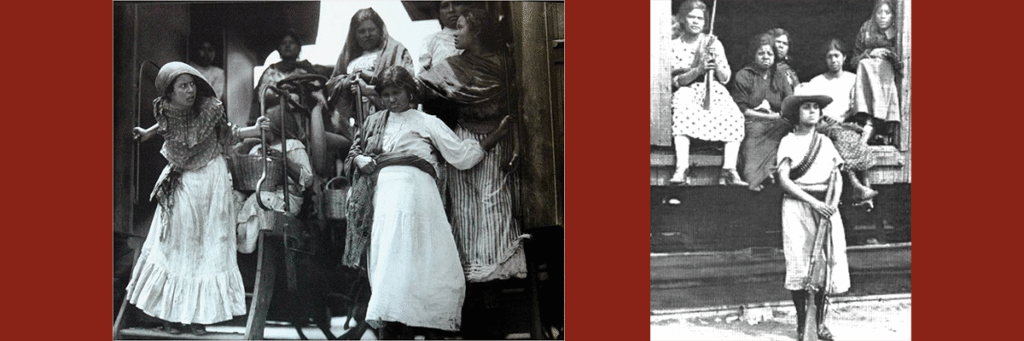 Con sus rebozos y canastos, las rieleras descienden de un tren. En la siguiente imagen, varias mujeres, con sus carabinas listas, esperan el momento de partir.