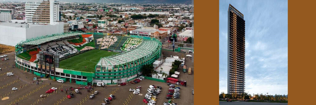 El “Nou Camp” es la catedral del futbol leonés y la Torre 40 Lumiere es el edificio más alto de la urbe.