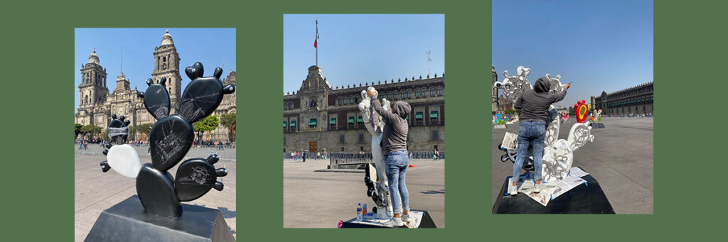 La exposición Nopalera en el corazón, inaugurada en la Feria del Nopal 2025 en el Monumento a la Revolución, inició con 50 piezas intervenidas por la misma cantidad de artistas y ahora, en esta segunda etapa, creció a 200. Es una intervención que transforma el zócalo en un jardín de memoria y contemplación. De esa cantidad, 13 piezas fueron intervenidas por artistas varones, 63 por mujeres, y 23 por colectivos o dúos artísticos.