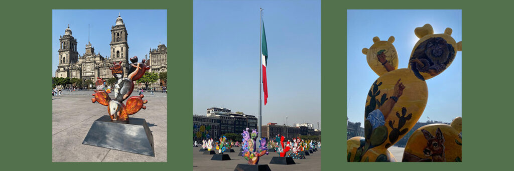 El nopal ha vuelto a tomar un papel protagónico, ahora en la exposición Nopalera en el corazón que se presenta en el zócalo capitalino, desde el pasado 9 de enero hasta el 9 de febrero próximo. Son 200 piezas de gran formato intervenidas por artistas que muestran al nopal como elemento de identidad nacional. La muestra plástica celebra las raíces de la nación mexicana y contó con el trabajo de 200 artistas libres y colectivos de la capital.