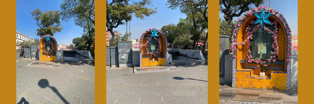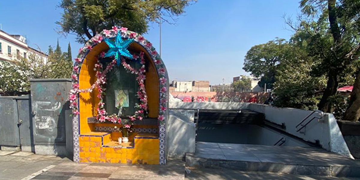 Efectivamente, se levantó en la salida del Metro más cercana al Templo de San Hipólito, en la intersección de Zarco y Paseo de la Reforma. Es un nicho sencillo, de talavera, y la imagen está protegida por un vidrio antibalas de tres cuartos de pulgada de espesor. La obra costó 20 mil pesos: 12 mil pesos fue de donaciones y el resto lo aportó el Metro.