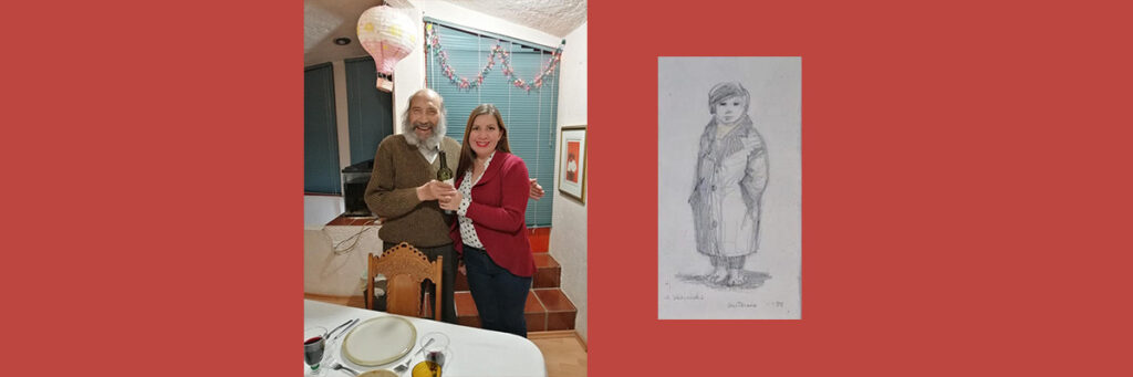 El maestro muralista y su nuera “Faby”. Siguiente imagen: retrato que el artista realizó a su hijo en 1985. (Fotografías: cortesía de Antonio González Arriaga)