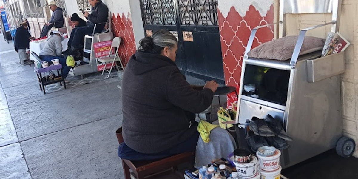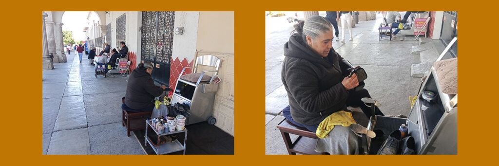 Como mujer de plática, mientras limpia y prepara un par de zapatos en sus manos, comenta que se dedica a asear calzado desde hace 26 años, que aprendió el oficio de su esposo y que el señor se dedica más a hacer ese trabajo en servicios a domicilio o en otros lugares. Ella aprendió y se dedicó a esa actividad “para cuidar el lugar”.