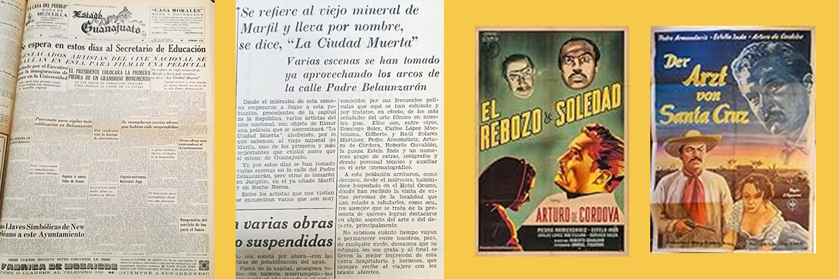 Portada del periódico “Estado de Guanajuato” del 2 de febrero de 1952, seguido de la nota correspondiente (periódico consultado en la hemeroteca del Archivo General del Estado). En seguida, dos carteles de la película que en alemán se llamó “El doctor de Santa Cruz”.
