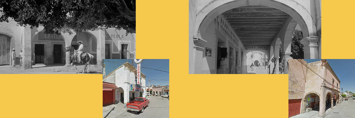 Escenas rodadas en Jaripitío (Aldama) en contraste con dos vistas de Jaripitío actualmente (fotografías tomadas de Google Earth).