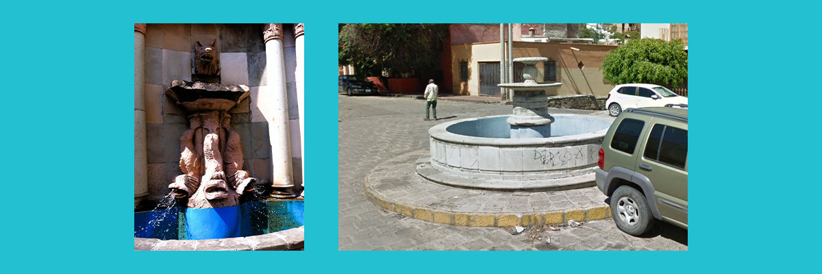 Un coyote y tres peces decoran el surtidor junto al templo de la Compañía. Siguiente imagen: Semiabandonado, el receptáculo de la Calzada de Guadalupe.