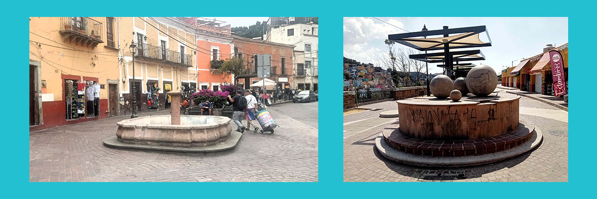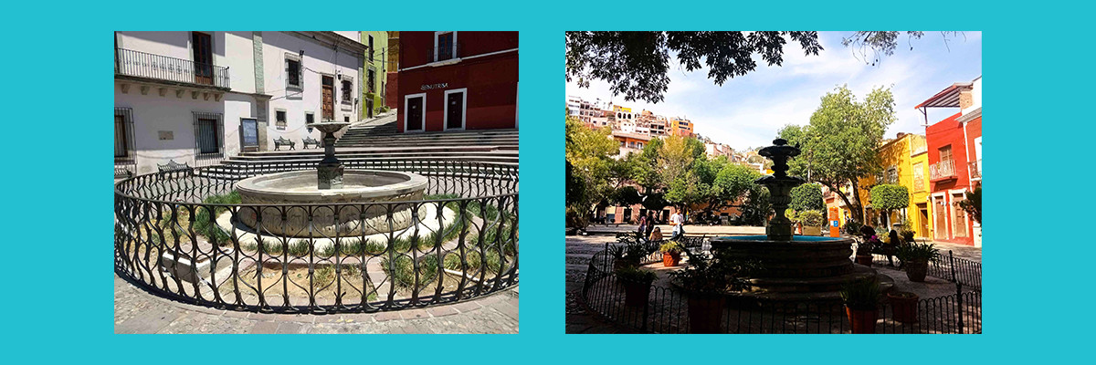 Muy cerca, a ambos lados de la Avenida Juárez, las plazas de Los Ángeles y San Fernando, así como el contiguo Jardín Reforma, muestran también sus respectivas fuentes. La primera funciona solo a veces, a pesar de su céntrica ubicación; en contraparte, las otras están entre las pocas siempre operativas. Estas últimas, situadas en centros neurálgicos de la vida cotidiana en Guanajuato, frecuentados por estudiantes, paseantes y turistas, presumen constantemente sus flujos de agua, además de aves juguetonas que suelen beber en los surtidores.