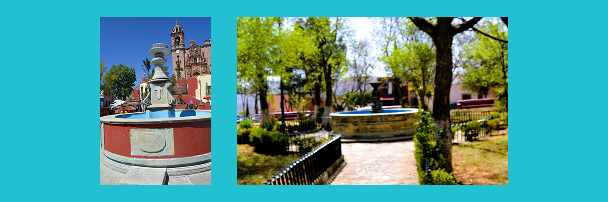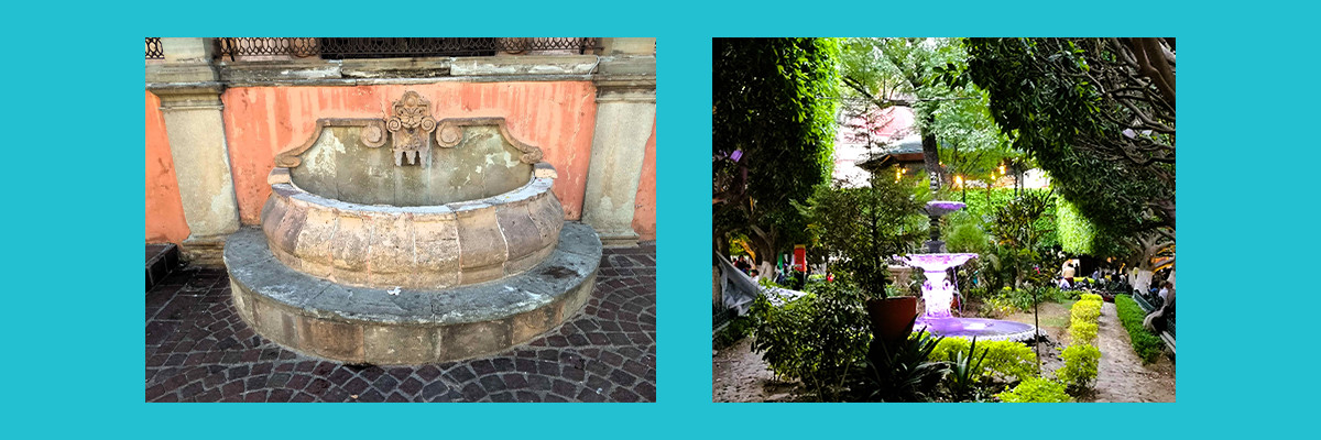 Muy cerca, adosada a la escalinata del templo de San Francisco, una cariátide diabólica revela una pequeña fuente con forma de medialuna, también siempre seca y además vandalizada, pues ha perdido la mayoría de las piezas superiores de cantera que la rodeaban, algo inexplicable en pleno centro histórico. Solo unos pasos más allá, el Jardín de la Unión presume sus dos pequeñas fuentes de metal en color plata y perfectamente funcionales, cuyos surtidores parecen verter sus chorros líquidos al compás de la música de la banda que cada jueves arroja sus notas sinfónicas desde el kiosco, en abierta competencia con los mariachis y grupos norteños de bares y restaurantes.