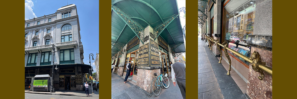 “La Palestina. Almacenes de Talabartería y Artefactos Nacionales” ya operaba en 1884, antes de la construcción del edificio actual levantado en 1903 durante los años de gloria del Porfiriato. Sus barandales con forma de cabeza equina son su símbolo, lo mismo que sus dos letreros con el mismo texto en ambos lados de la esquina de 5 de mayo y Bolívar.